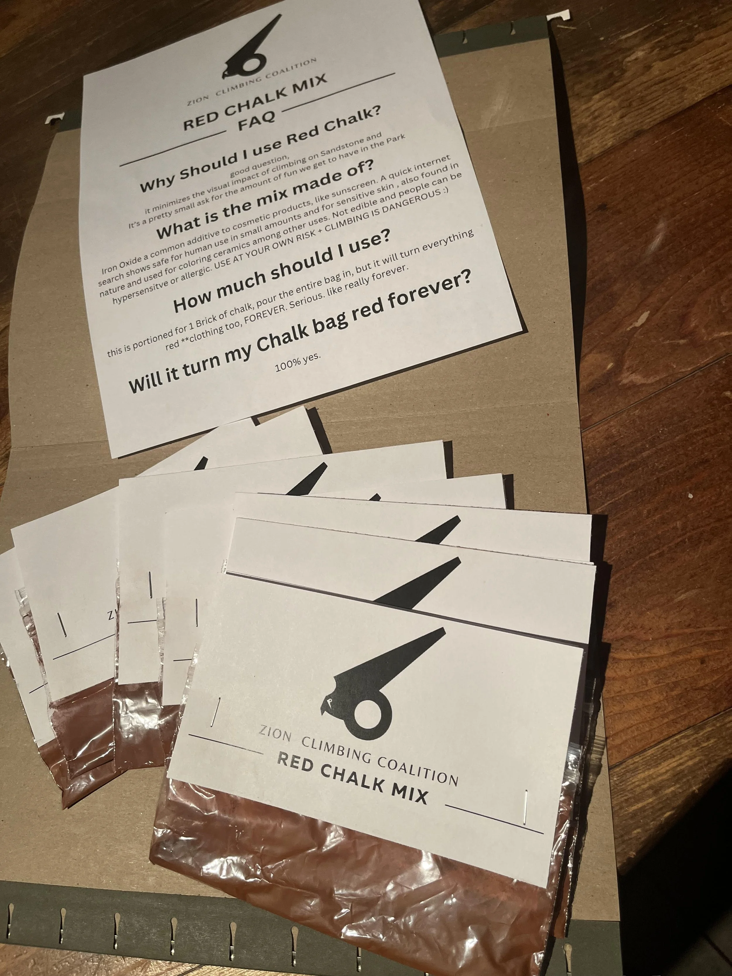 Red chalk mix (iron oxide) is available at Zion Outdoor in Springdale and Amazing Adventures in La Verkin. We ask for a donation of $5, or just take one and get us later. If you have $10 to spare, pay for someone else’s.